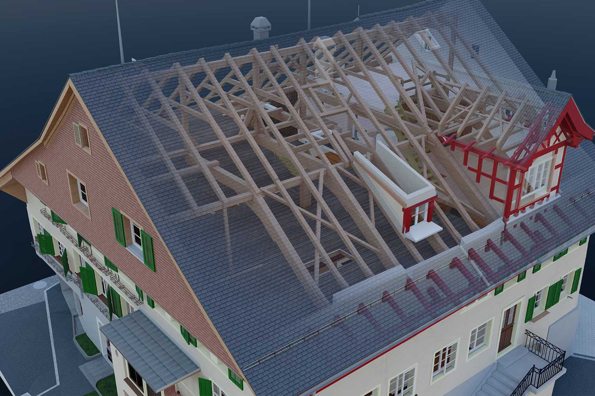 L'ancien « Gemeinde- und Gesellenhaus » (maison communale et maison des compagnons) « Kronenweg » à Stäfa (ZH) est un témoin important de l'histoire de l'architecture et de la construction. HMQ AG a réalisé en deux étapes des relevés du bâtiment à l'aide d'un scanner laser 3D. À partir des relevés de la première étape, un modèle 3D complet de l'état actuel avant démolition a été modélisé. Le relevé du bâtiment et la modélisation 3D de l'ensemble de la structure brute ont été réalisés après la démolition, au cours de la deuxième étape.
