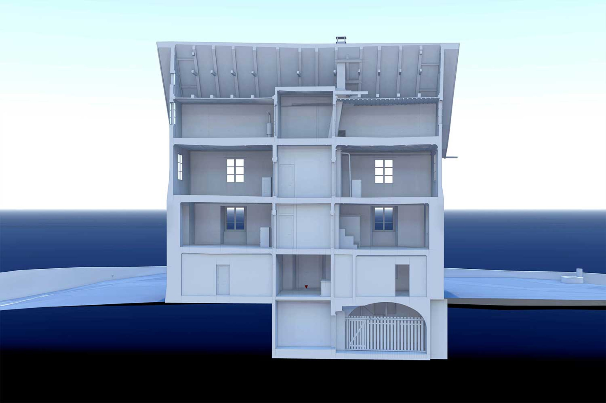 La société HMQ AG a réalisé un relevé complet du bâtiment classé monument historique « Kapf » ainsi que du terrain et a modélisé un jumeau numérique sous forme de modèle 3D dans ArchiCAD. La maison « Kapf » a été construite en 1736 comme maison de vigneron et maison de loisirs pour le monastère de Muri. L'histoire détaillée de la construction et la description du bâtiment sont documentées dans l'inventaire des monuments historiques du service cantonal de conservation des monuments historiques d'Argovie. Les monuments historiques sont classés selon différents critères. Les plus importants sont la valeur historique, typologique et artistique ainsi que la qualité de l'emplacement de l'objet. La maison « Kapf » obtient des notes élevées à très élevées dans les quatre catégories de base.