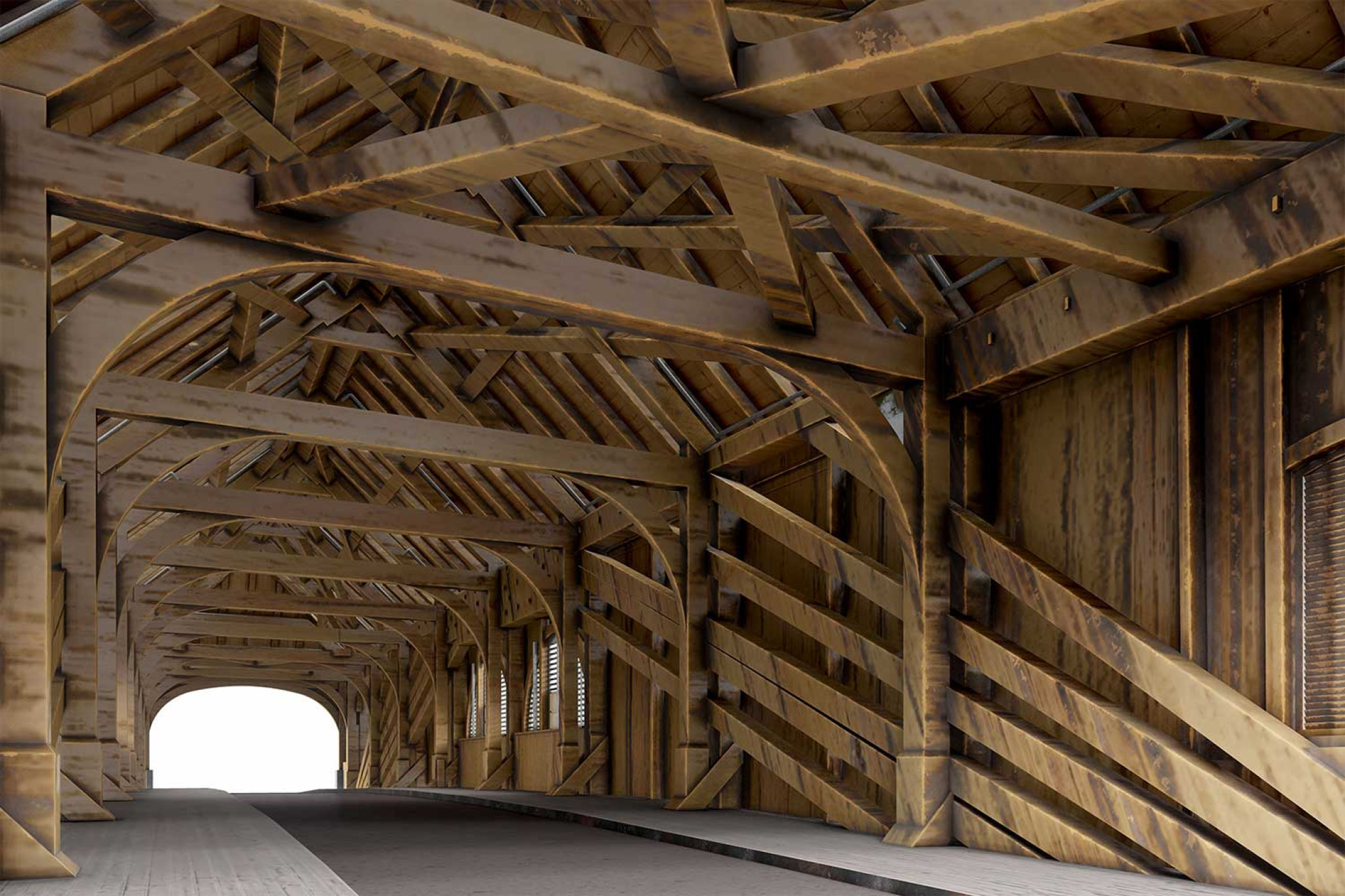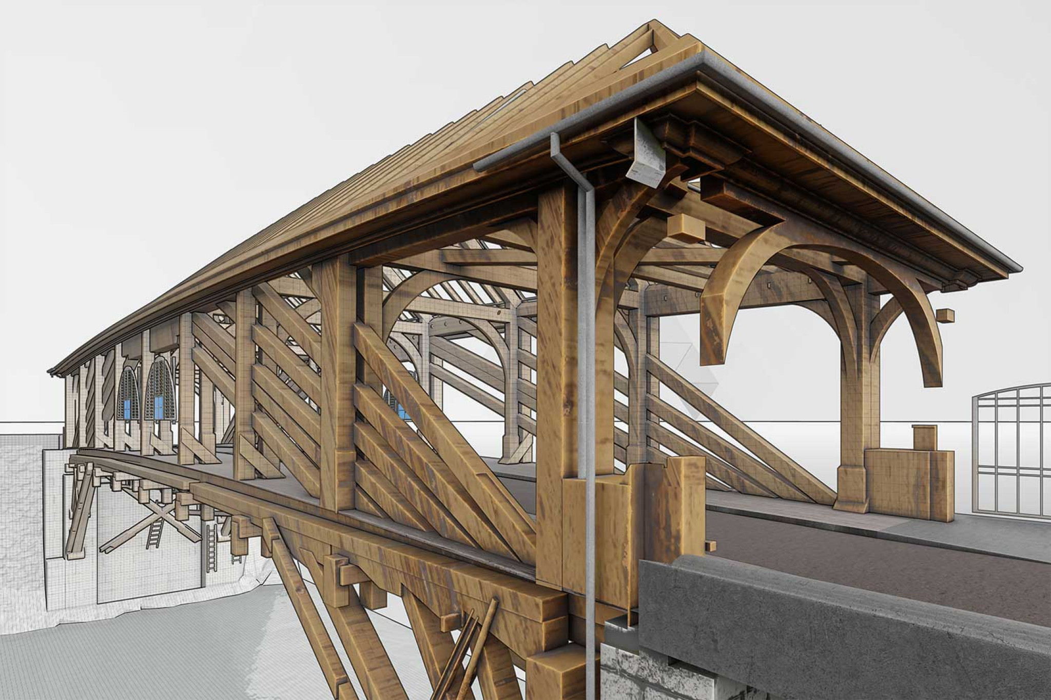 La société HMQ AG a mesuré l'ancien pont douanier de Baden AG à l'aide d'un scanner laser 3D. À partir des données enregistrées, le pont a été entièrement reconstruit et modélisé en 3D. Le modèle numérique 3D de HMQ AG sert de base à la planification d'une conduite de chauffage urbain sous le pont historique en bois. Dans ce cadre, le pont doit être renforcé, en tenant compte des aspects liés à la préservation des monuments historiques.