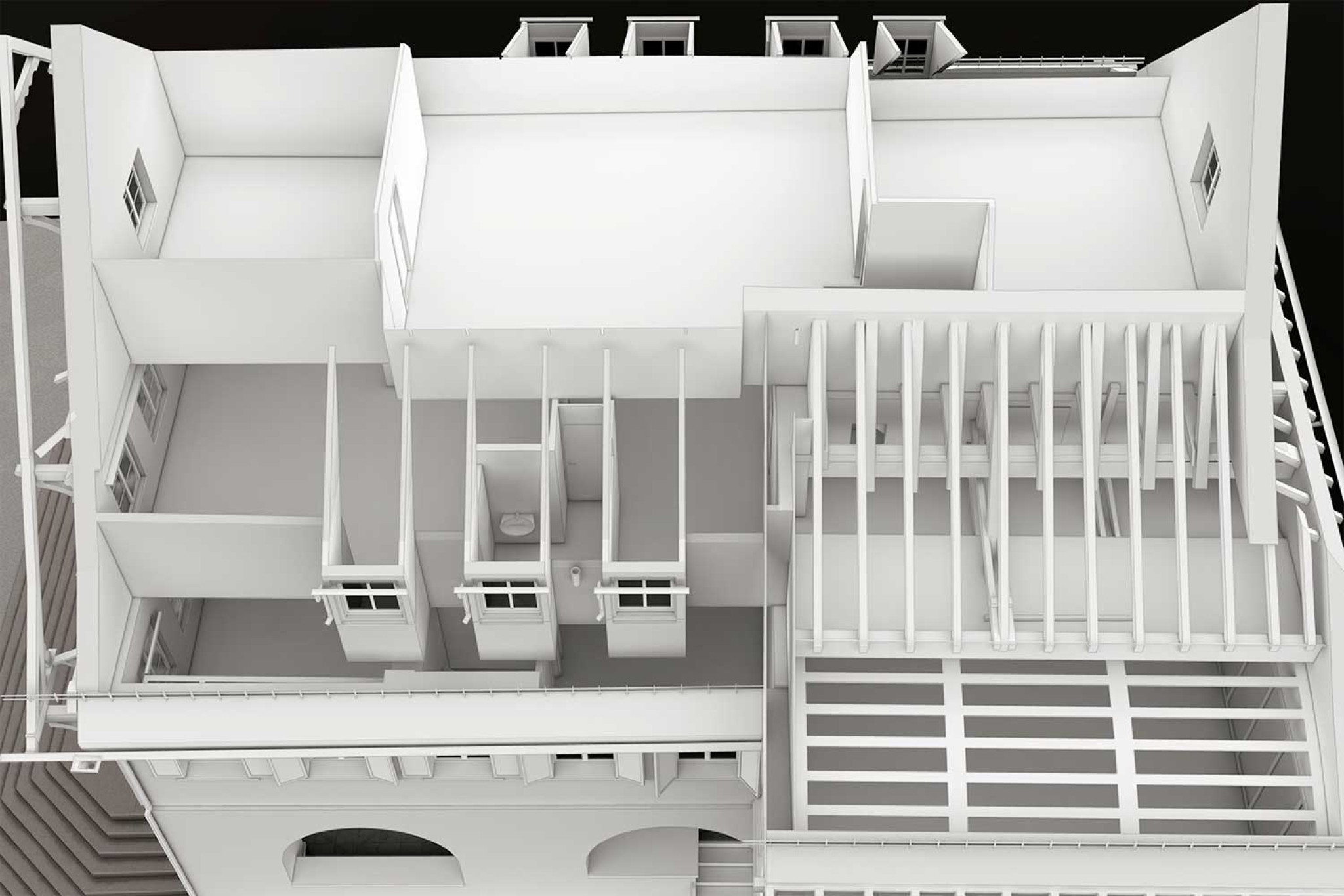 La société HMG AG a réalisé le relevé du bâtiment et la modélisation 3D de la mairie de Berneck. En deux jours, toutes les vues et toutes les pièces des quatre étages de ce bâtiment historique ont été mesurées à l'aide d'un scanner laser. Le nuage de points 3D a servi de base à la modélisation d'un modèle BIM 3D réaliste.