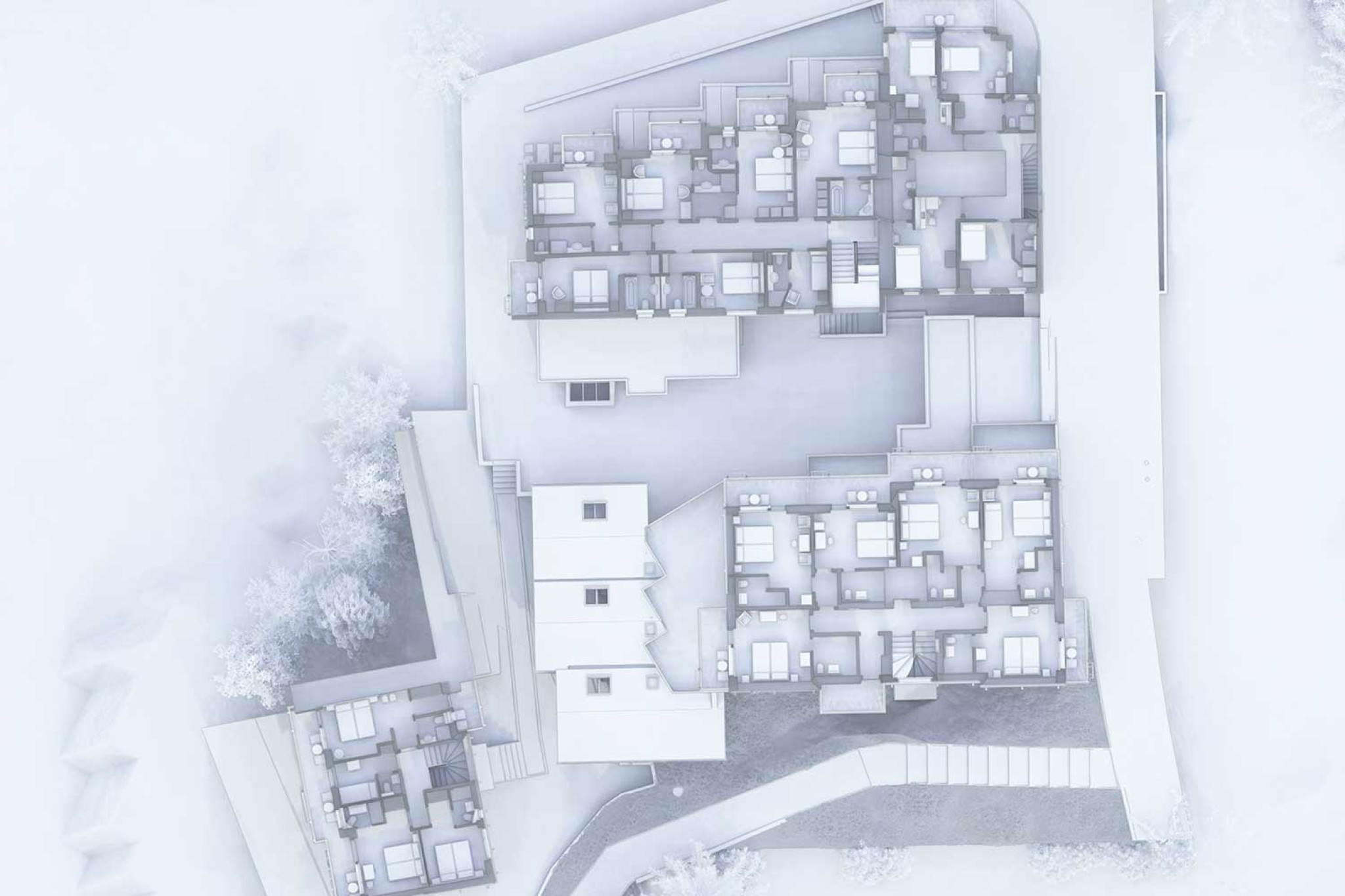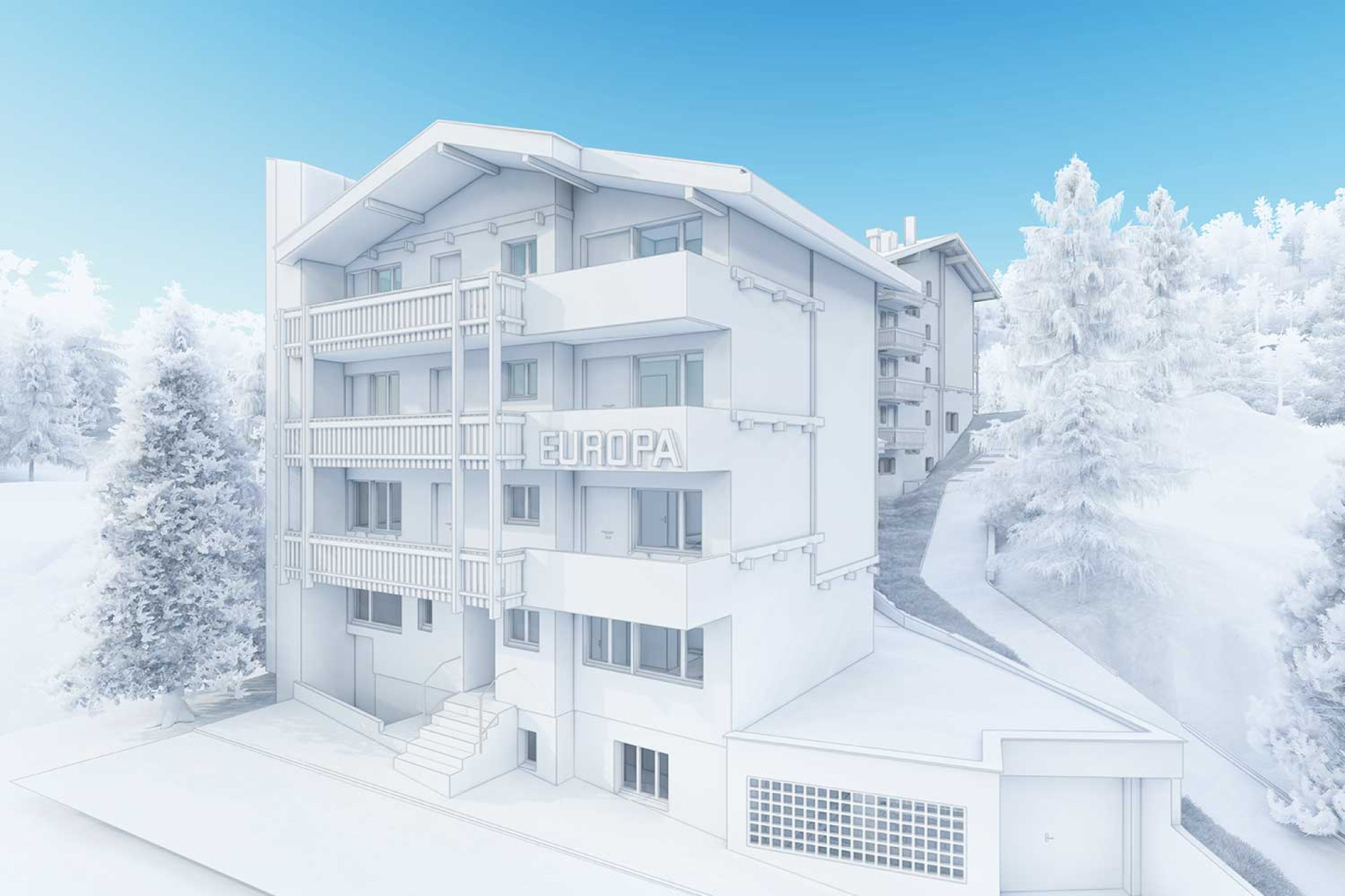 La société HMQ AG a réalisé un relevé du bâtiment de l'hôtel Europa à Saas-Fee, dans le Valais. Grâce à un balayage laser 3D, plusieurs bâtiments ainsi que le paysage ont été enregistrés avec précision. À la demande du client, l'aménagement intérieur de l'hôtel a été évalué dans une représentation simplifiée sous forme de maquette. Le modèle 3D final, avec un niveau de détail LOD 1:100, reproduit fidèlement l'hôtel et ses environs et a été fourni dans un format compatible BIM.