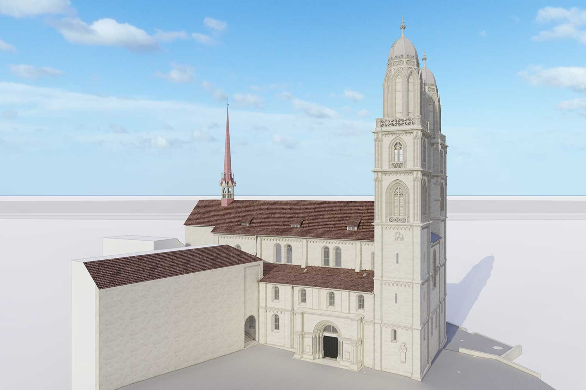 En 2014, HMQ AG a réalisé un relevé détaillé du Grossmünster à Zurich. Dans un premier temps, des plans en 2D ont été créés. Sur la base des relevés effectués à l'époque, HMQ AG a modélisé en 2022 un modèle 3D précis de cet édifice historique. Le nuage de points archivé a permis de modéliser un modèle architectural 3D réaliste du Grossmünster, qui reflète fidèlement la complexité et le caractère unique de cet important monument culturel. Cette documentation numérique sert non seulement à la préservation du monument, mais permet également des études architecturales détaillées, ce qui améliore considérablement l'accessibilité et la compréhension de cet emblème historique.
