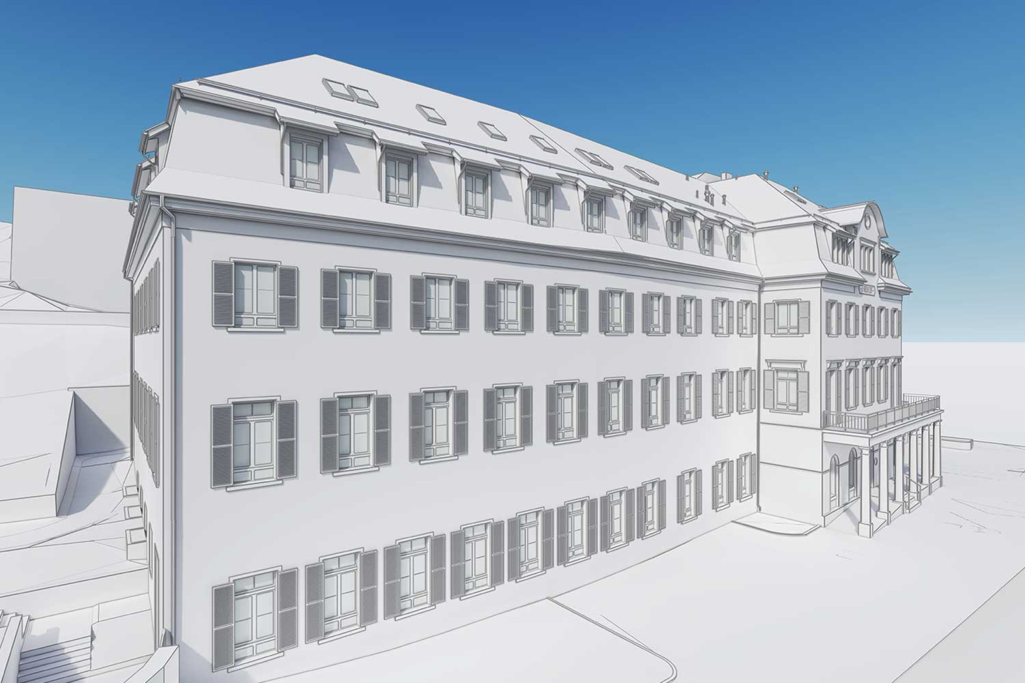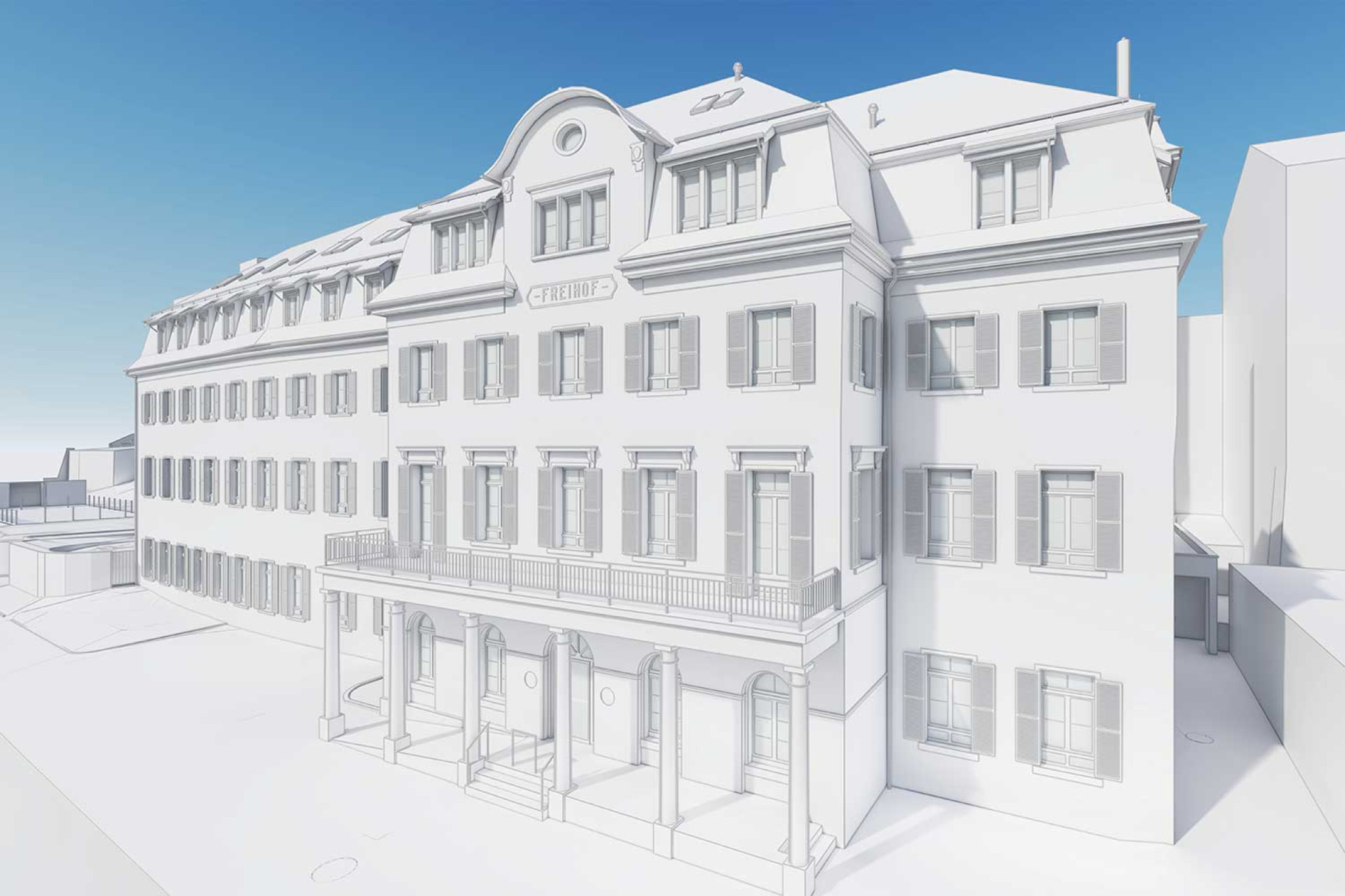 La société HMQ AG a réalisé un relevé précis du bâtiment de la clinique de rééducation Freihof. À l'aide d'un scanner laser 3D, un nuage de points détaillé a été créé, à partir duquel un modèle 3D complet de la clinique a été généré. Celui-ci comprend tous les étages, les façades et les environs. Le modèle 3D compatible BIM a été modélisé dans ArchiCAD et transmis sous forme de fichier ArchiCAD (.PLA) et de fichier IFC pour un traitement ultérieur. La saisie exacte des géométries permet une utilisation précise des données à des fins de planification et d'analyse supplémentaires.