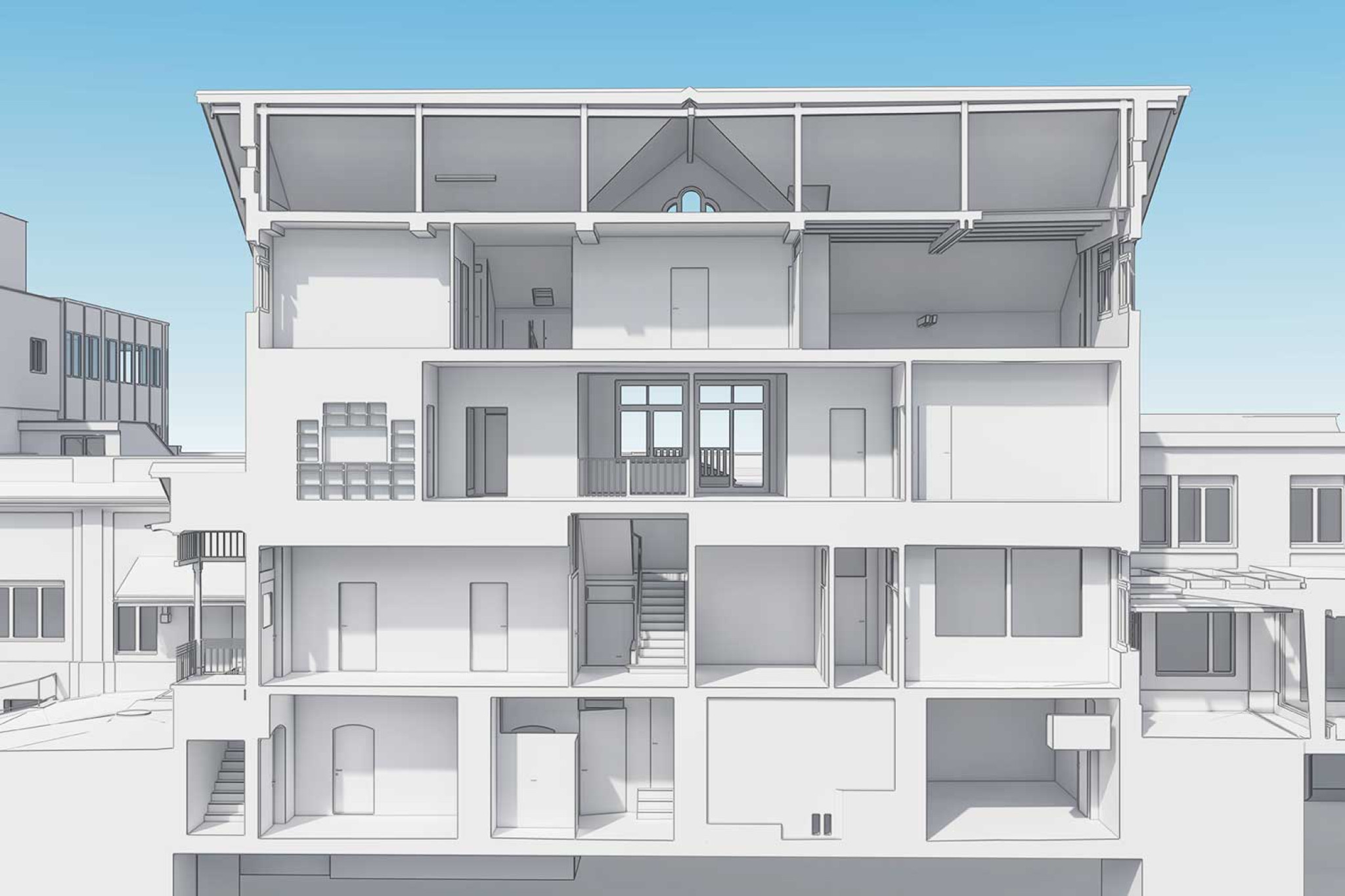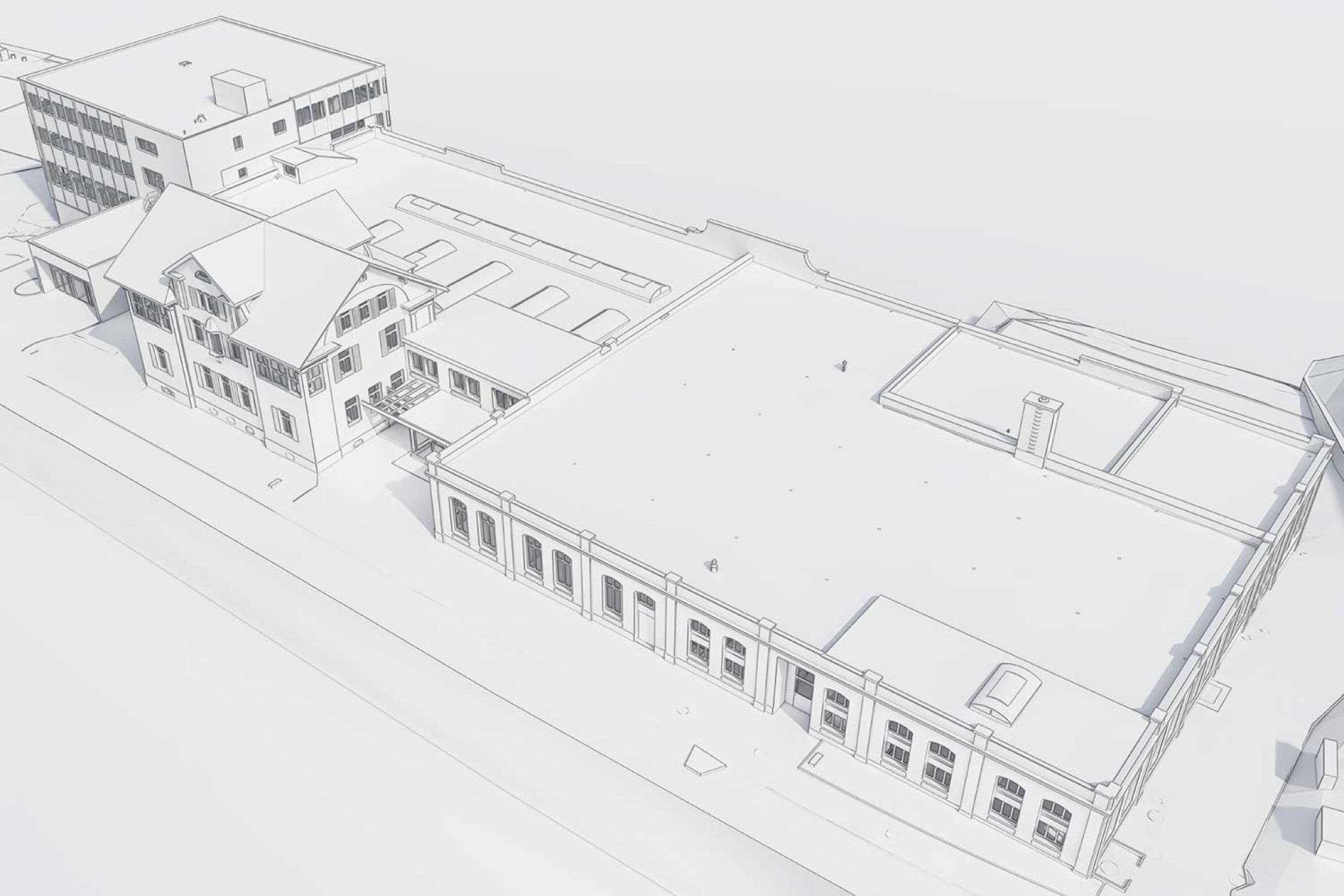 La société HMQ AG a réalisé un modèle 3D du site industriel de Wetzikon avec l'ancienne usine de tissage de soie. Le relevé des bâtiments à l'aide d'un scanner laser 3D a porté sur la villa au nord et le bâtiment de l'usine au sud. Ce complexe industriel du début du XXe siècle se caractérise par une architecture claire et fonctionnelle, avec des structures massives et des façades symétriques. Le modèle 3D précis reproduit les structures existantes dans les moindres détails et sert de base à la planification.