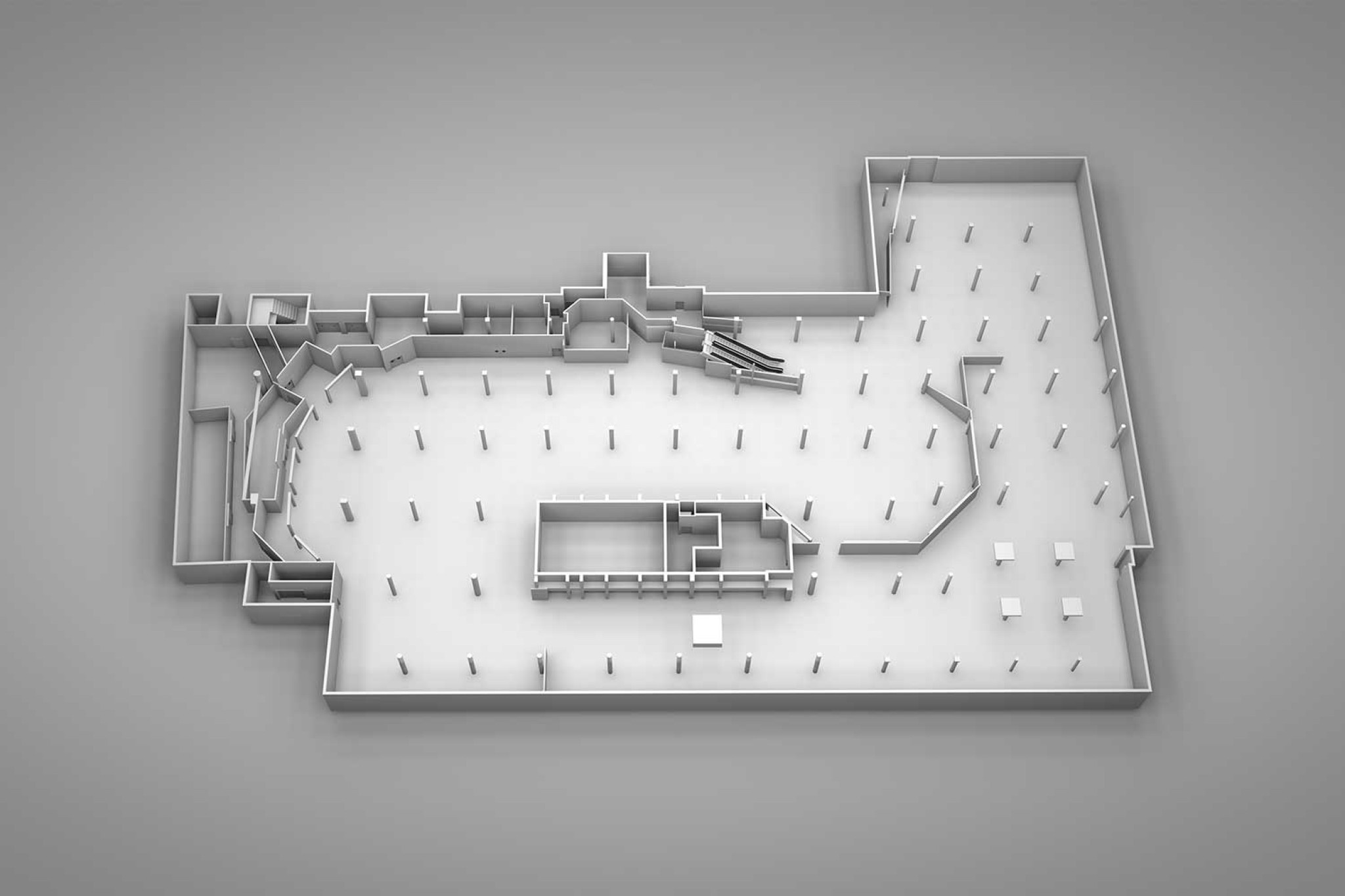 La société HMQ AG a numérisé l'ensemble de la surface de vente (environ 5 500 mètres carrés) du « Migros Limmatplatz » à l'aide d'un scanner laser 3D et a élaboré un modèle 3D complet à partir du nuage de points. Le modèle 3D a été modélisé uniquement avec la structure « vidée » du bâtiment, c'est-à-dire sans aucun aménagement, étagères, etc. En plus du modèle 3D dans ArchiCAD version 20, les données brutes (nuage de points 3D) et une visite panoramique en photos ont également été fournies.