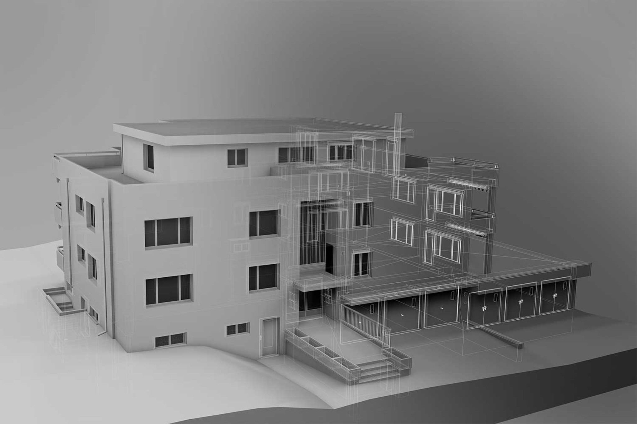 HMQ AG a photographié quatre façades d'un immeuble collectif à Opfiken (ZH). À partir des plans de façade en 2D, un modèle 3D complet a été élaboré dans ArchiCAD. La modélisation 3D des fenêtres et des balcons a été réalisée avec un niveau de détail accru, conformément aux souhaits du client.