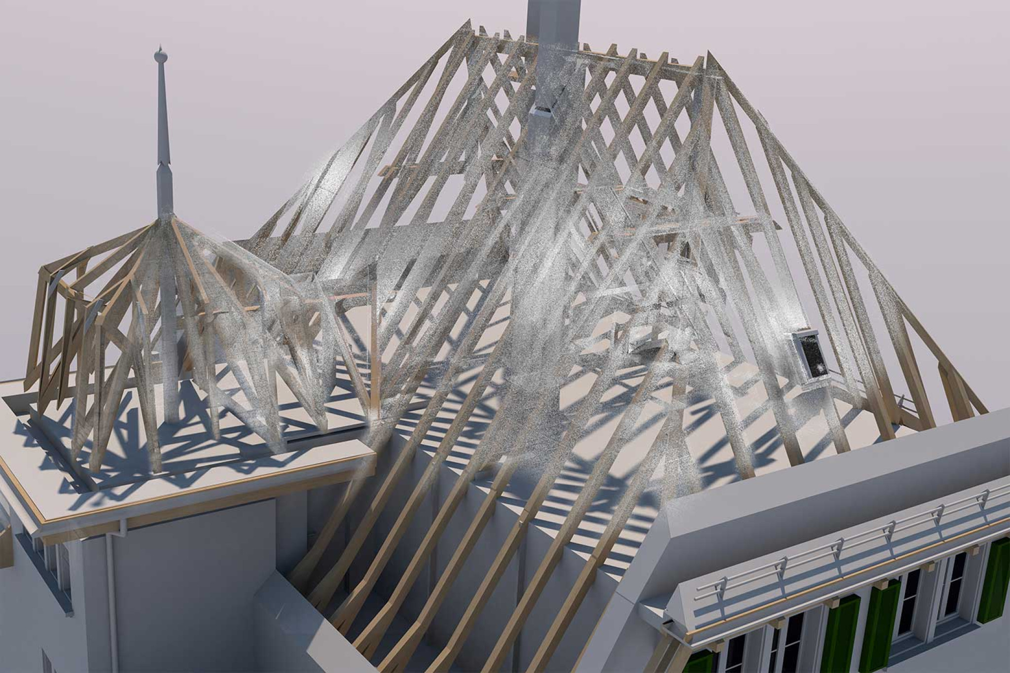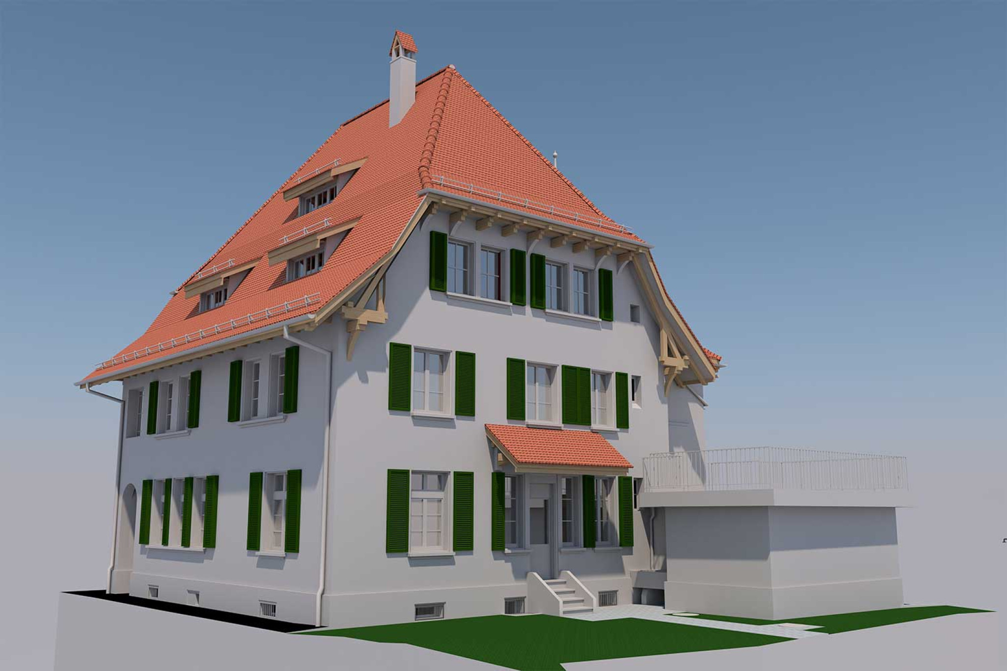 À Berne (BE), HMQ AG a réalisé le relevé d'une villa de style Art nouveau. Sur cinq étages au total, toutes les pièces et chambres ainsi que les vues des façades ont été mesurées à l'aide d'un scanner laser 3D . La modélisation 3D a été réalisée à partir du nuage de points évalué dans ArchiCAD. Le modèle 3D devant être traité et édité dans Vectorworks, les données ont été fournies dans le format d'échange standard via l'interface de données IFC.