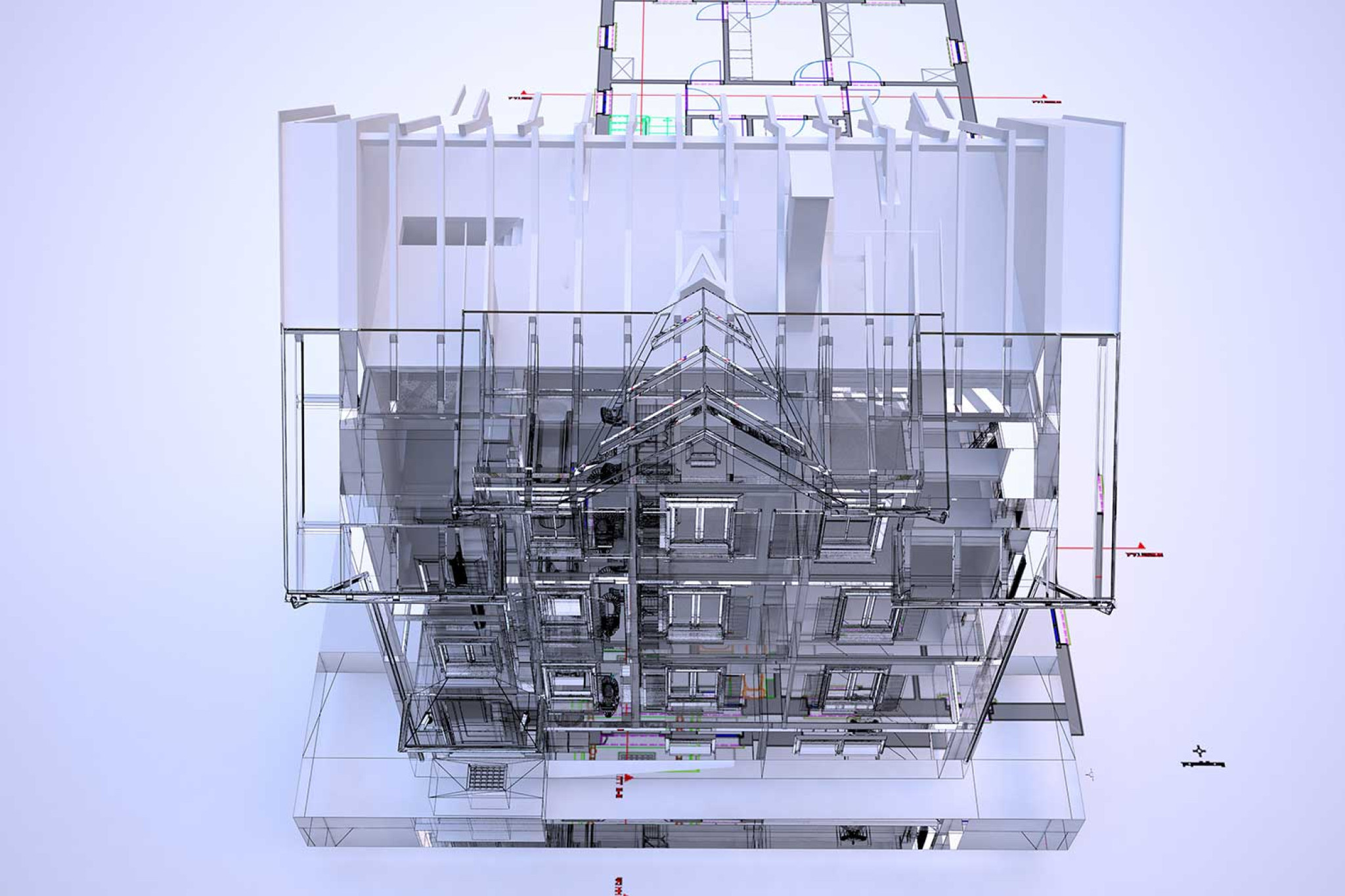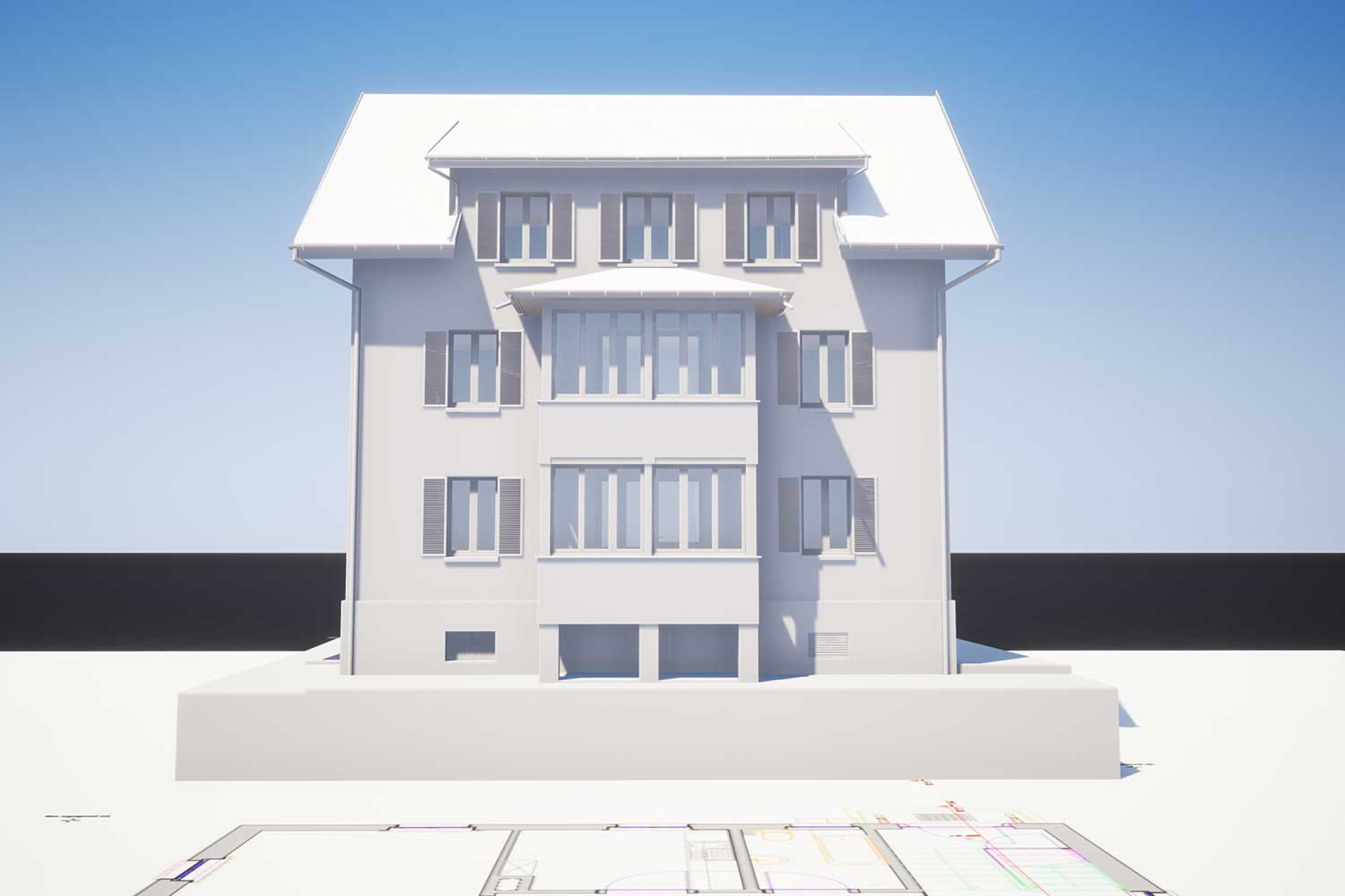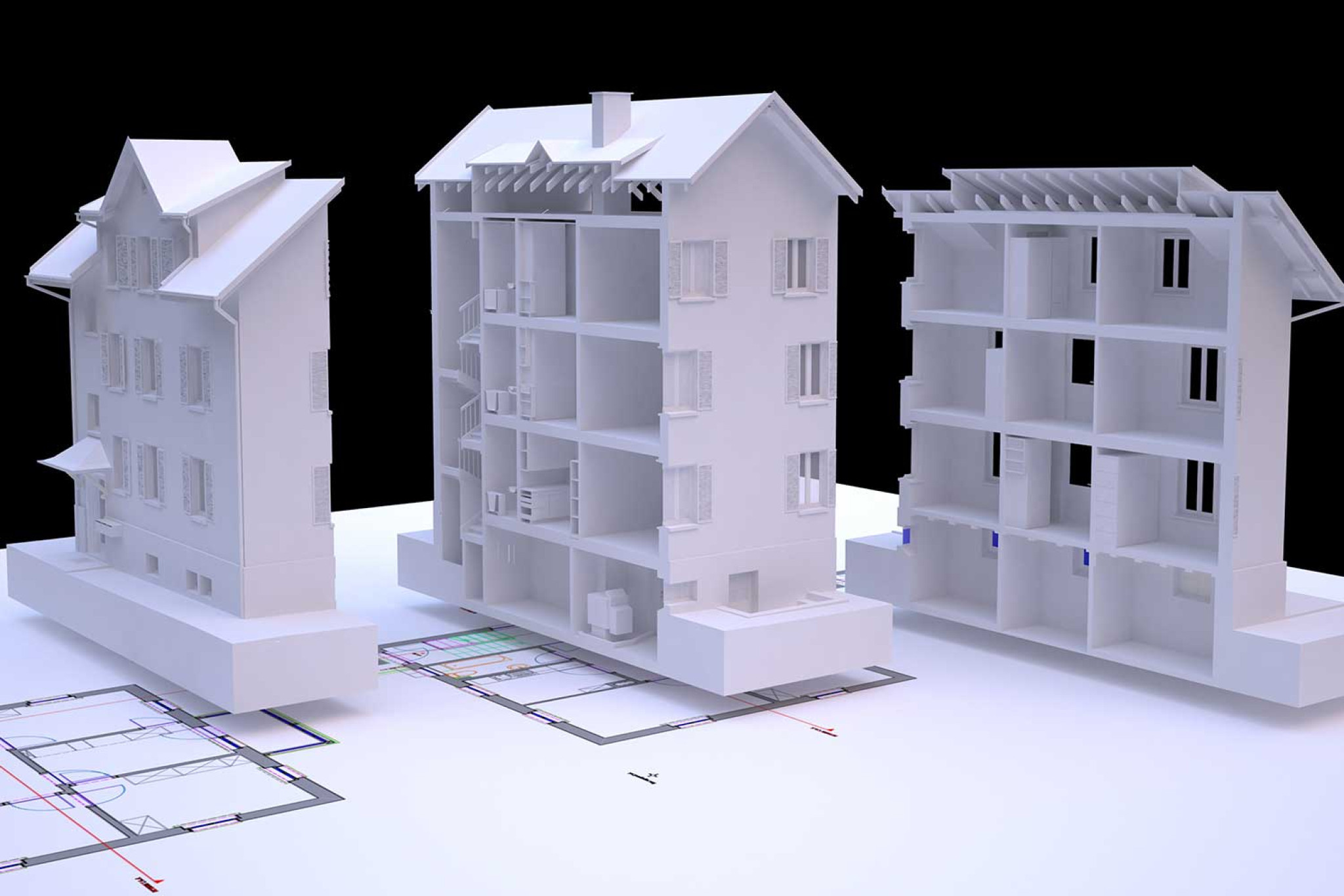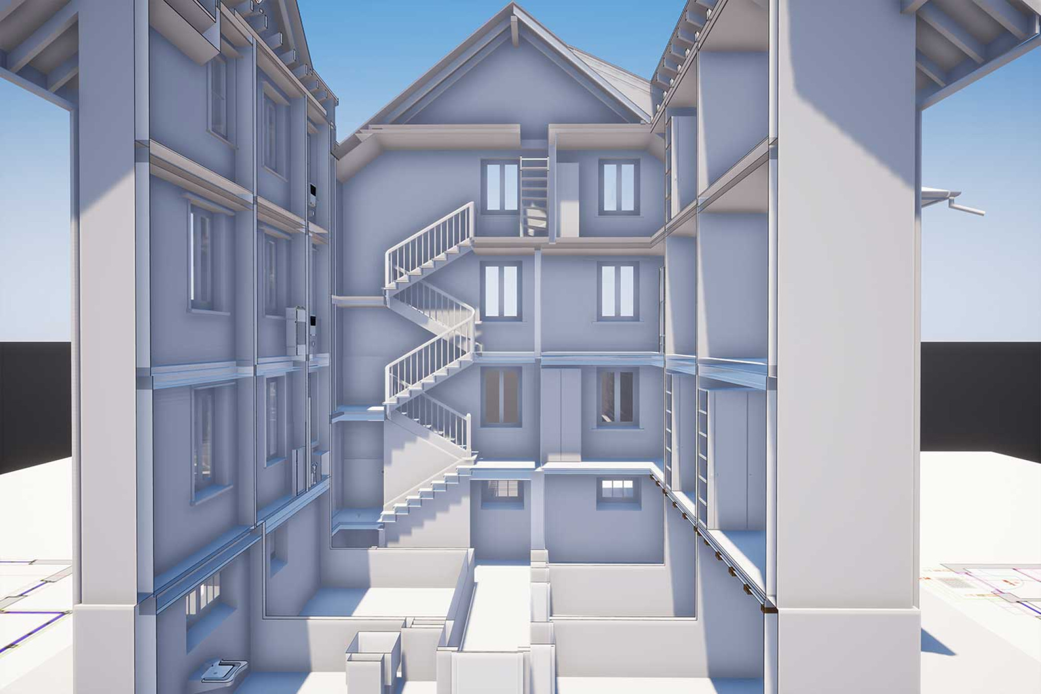 La société HMQ AG a réalisé un relevé topographique d'un immeuble collectif à Rheineck (SG) à l'aide d'un scanner laser. À partir du nuage de points, un modèle CAO 3D numérique a été créé dans ArchiCAD. Dans un premier temps, il fallait établir pour le client les plans actuels et les coupes du bâtiment. Grâce à la modélisation 3D, il est désormais possible de générer n'importe quelle coupe et vue, tant dans le sens horizontal que vertical, à partir du modèle 3D.