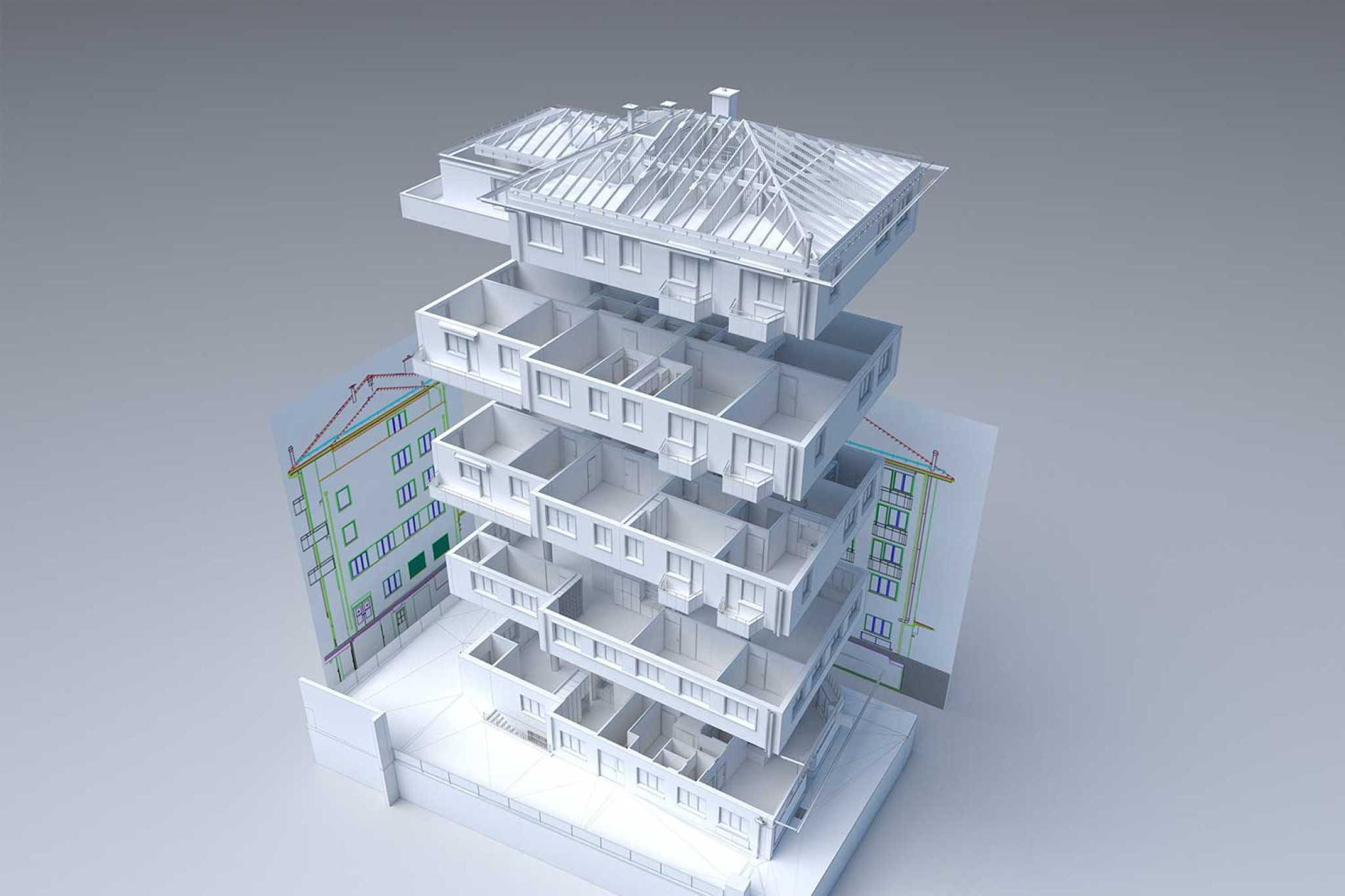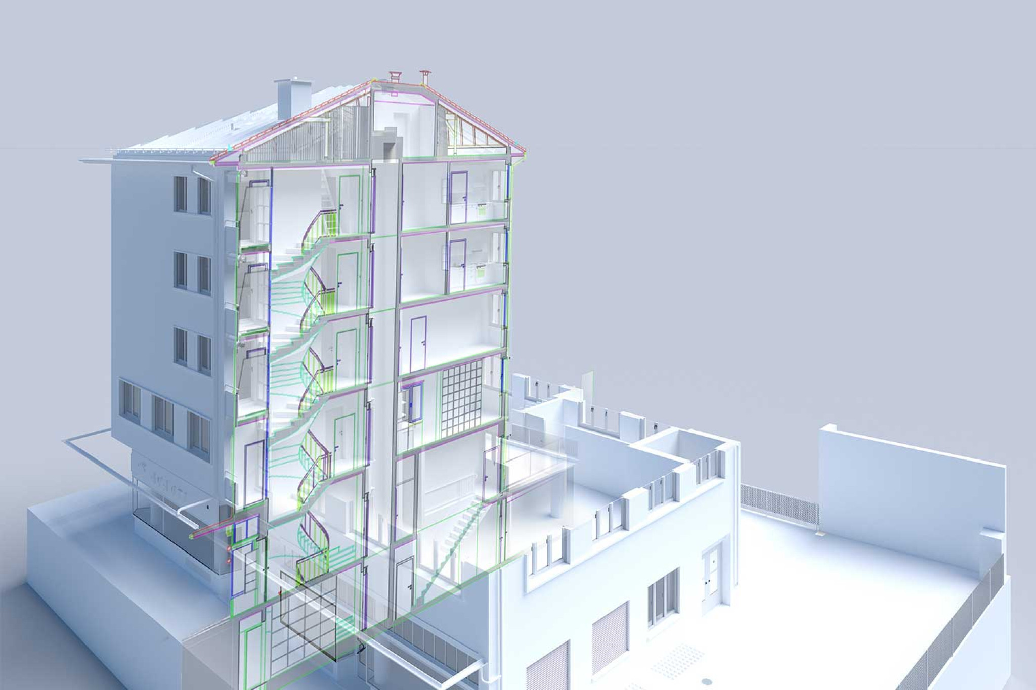 À partir d'un bâtiment résidentiel et commercial de sept étages situé à Zurich (ZH), HMQ AG a modélisé un modèle 3D dans ArchiCAD à partir d'un relevé du bâtiment. La modélisation a été réalisée à partir d'un nuage de points 3D. Le relevé du bâtiment à l'aide d'un scanner laser a été effectué alors que l'immeuble était habité et a duré trois jours ouvrables sur place. La représentation et les détails ont été réalisés selon une norme basée sur le niveau de détail LOD (conformément à la spécification HMQ) et s'appuient sur la norme SIA 2051.