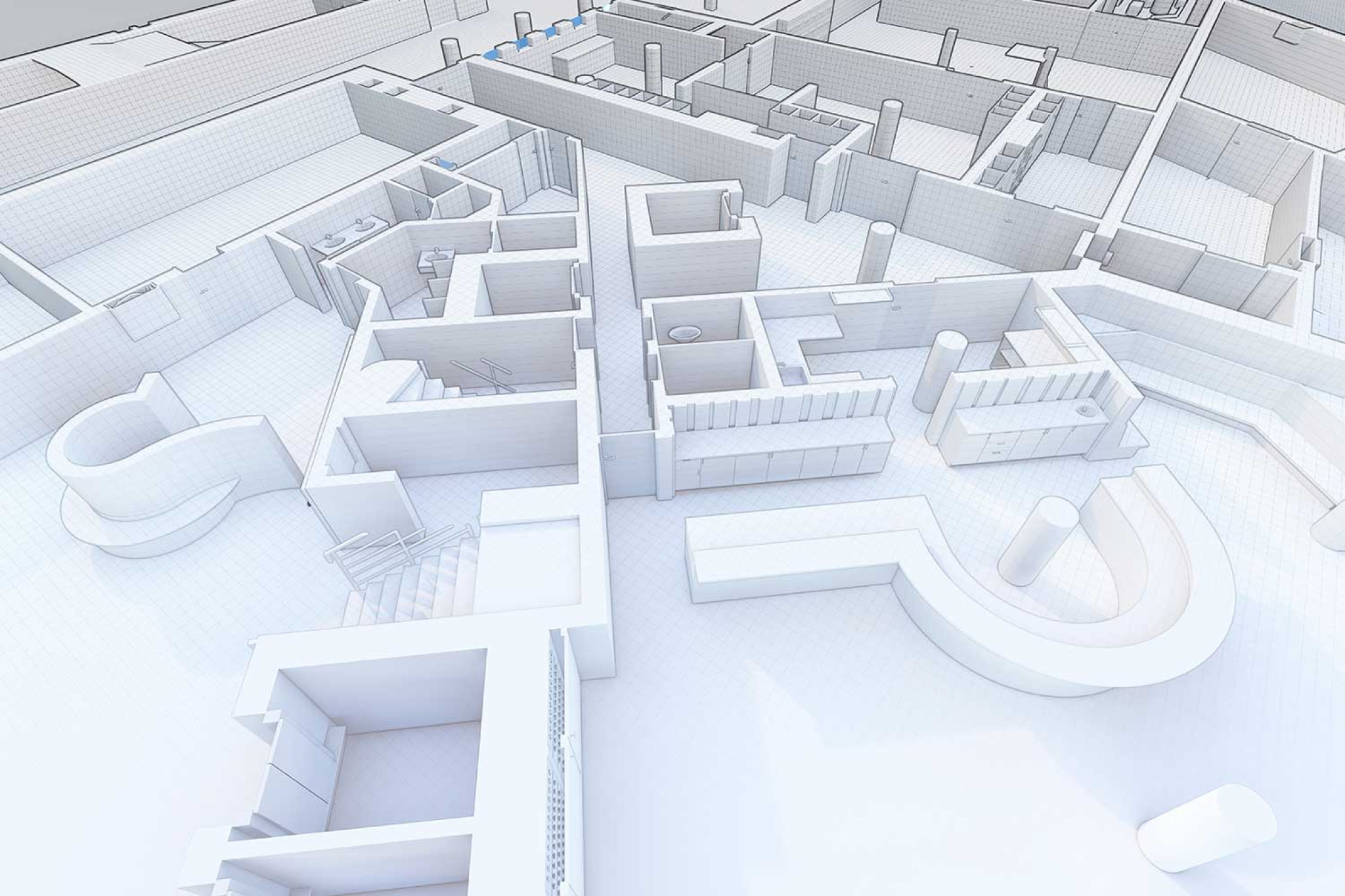 HMQ AG a réalisé un relevé du bâtiment de l'hôtel Schweizerhof à Sils i.E. et a modélisé un modèle 3D dans ArchiCAD. L'ensemble du sous-sol avec le parking, ainsi que la piscine au rez-de-chaussée et l'étage de la galerie ont été relevés à l'aide d'un scanner laser 3D. La modélisation 3D a été réalisée à partir du nuage de points.
