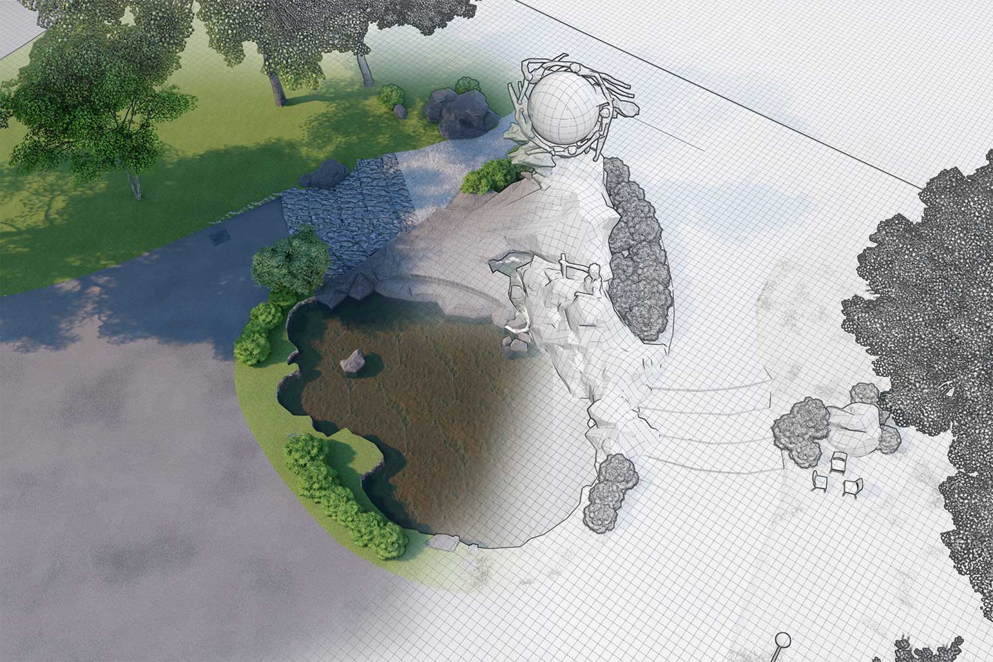 La société HMQ AG a mesuré le Monument de la Poste mondiale situé sur la Petite Schanze à Berne (BE) à l'aided'un scanner laser 3D. À partir dunuage de points 3D, une reproduction exacte du monument, y compris son environnement immédiat avec le large bassin de la fontaine et les formations rocheuses artificielles, a été modélisée sous forme de modèle numérique 3D. La sculpture en bronze intitulée « Autour du monde » a été réalisée par le Français René de Saint-Marceaux (1845-1915) et inaugurée le 4 octobre 1909. Elle a coûté à l'époque environ 200 000 francs suisses.